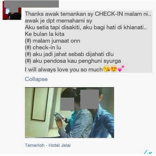 Si lelaki dengan bangganya muat naik moment mengatakan dia bersama pasangannya ‘check-in’ hotel untuk ‘melayari’ kebahagiaan dorang pada malam jumaat.. Tak boleh blah lagi tu, siap beritahu hotel mana dorang ‘check-in’!