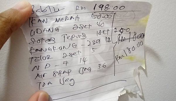 "Bila saya suruh juruwang kira, dia kata RM198. Saya minta bil dan tulis harga setiap lauk. Dia menolak dan kata kalau kira satu persatu, lagi mahal jadinya. Saya cakap tak apa, saya bayar ikut apa yang saya pesan.