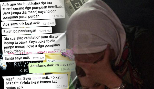 "Betul. Suaminya bukan out station bekerja tapi bercuti dengan isteri orang yang berniqab itu. Ya. Seperti yang dijangka, bila isteri malang ni scroll mesej di antara suaminya dan perempuan berniqab itu, ada gambar mereka berdua atas katil.