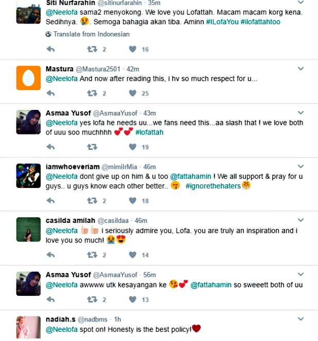 Respon itu ditulis di laman sosial Twitter baru baru ini dan ramai peminat 'Lofattah' membuat andaian tweet itu ditujukan kepada Fattah Amin.