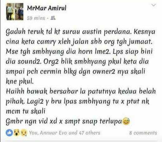 "Kesnya, pemandu kereta Camry tak dapat jalan sebab orang tengah sembahyang Jumaat. Masa tengah sembahyang, dia bunyikan hon lama-lama.